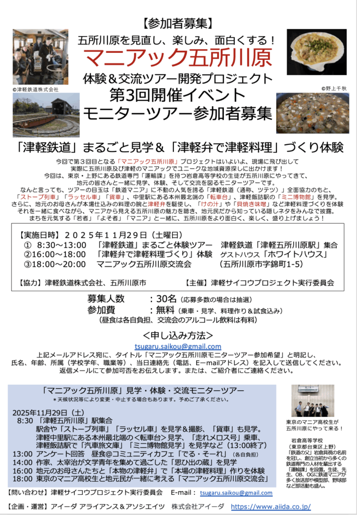 株式会社アイーダ(岩崎徹代表取締役CEO)はこのほど、青森県五所川原市で実施展開してる地域観光事業「津軽サイコウプロジェクト」(津島克正実行委員長)主催の「マニアック五所川原」プロジェクトのモニターツアーを実施・運営します。これに伴い、以下の案内で募集します(応募多数の場合は抽選)。